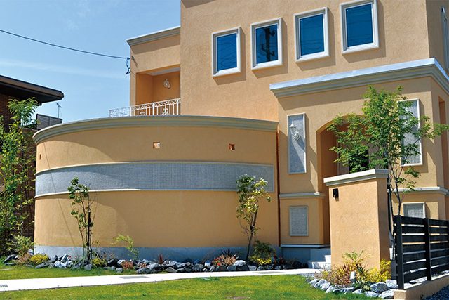 グランドアートウォールは「特殊発泡素材」を採用しているため、カーブ形状をつけたり、好きな位置に小窓を付けるなど自由なデザインに仕上げることができます。また、仕上げ方法も「塗り壁」「タイル張り」「吹付け」など豊富にあり、建物とのコーディネートが可能となります。