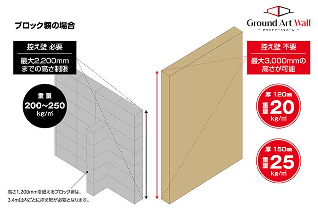 ですが、グランドアートウォールは、自重が軽いため特殊な基礎・型枠工事などが不要になり、金額を抑えて施工が可能となります。